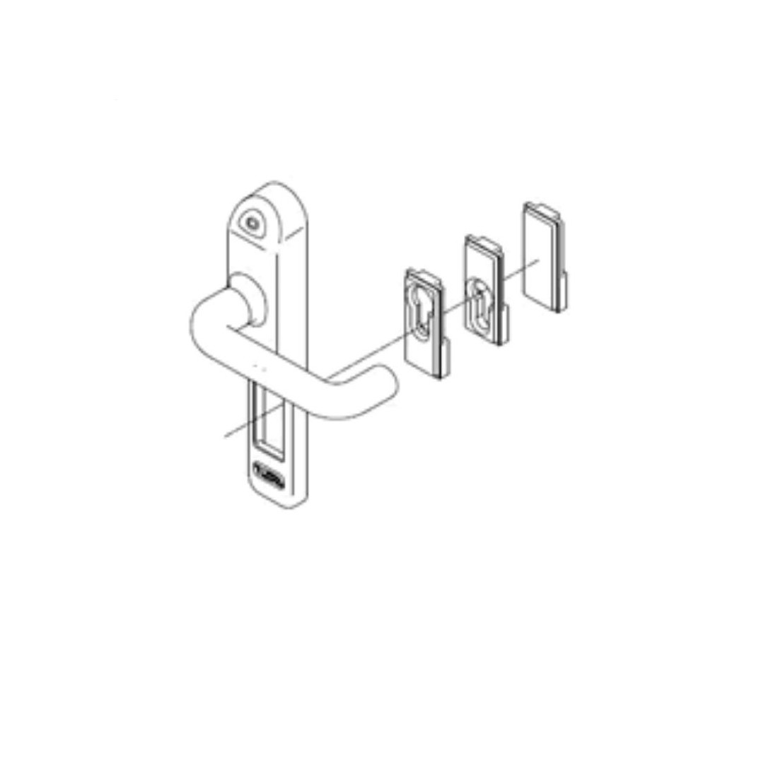 La maniglia elettrica è fornita con 3 piastrini compatibili con gli interassi 72 e 92 della serratura. Piastrino cieco da usare in caso di assenza del cilindro